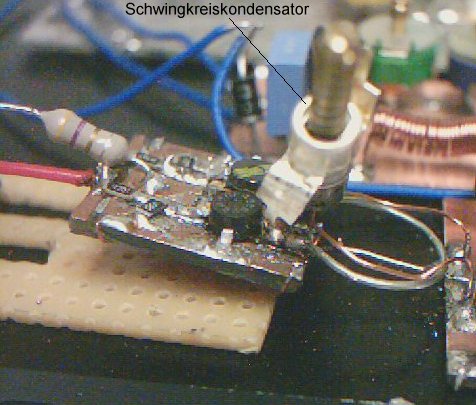 Der Mikrowellensender wurde an die Frequenz angepasst indem eine Spule mit einem Durchmesser von 12 mm verwendet wurde. Die Spule besteht aus einem versilberten Kupferdraht mit 0,5 bis 1 mm Durchmesser. Mit der im Bild sichtbaren zweiten Spule (Kupferlackdraht ca. 0,5 mm Drahtdurchmesser) wird die erste Verstärkerstufe angekoppelt. Die Stärke der Kopplung kann durch Verbiegen dieser Spule eingestellt werden. Je dichter diese beiden Spulen nebeneinander liegen desto fester die Kopplung. Prinzipiell ist es wünschenswert einen Steuersender so schwach wie möglich an den ersten Verstärker anzukoppeln weil diese erste Verstärkerstufe auf den Steuersender zurückwirkt. Das heißt, daß wenn man an der Verstärkerstufe Einstellungen vornimmt, diese Einstellungen auch den Steuersender beeinflussen und sich so seine Frequenz verschiebt. Zusätzlich wurden gegenüber dem Schaltplan die beiden Enden der Spule mit einem Schwingkreiskondensator verbunden (Trimmer 0,5 Pikofarad bis 3,5 Pikofarad), mit dem die Frequenz des Steuersenders eingestellt werden kann.