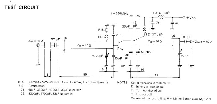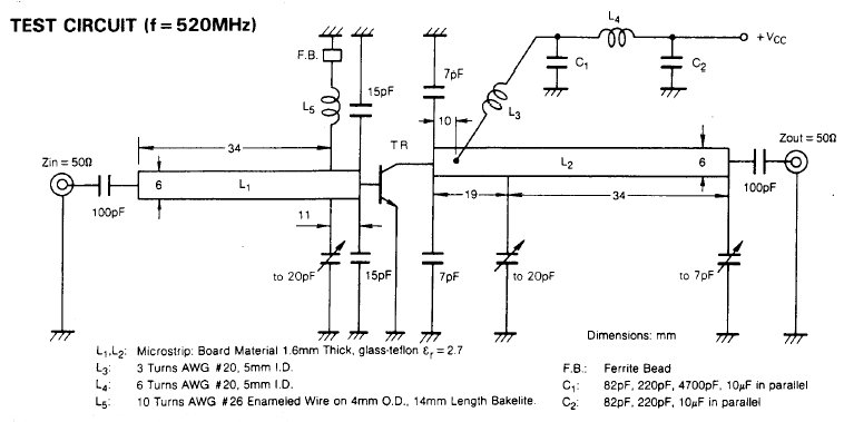 Die erste Stufe ist dem Datenblatt von Mitsubishi für den Transistor 2SC 3019 entnommen. Wir haben für diese Verstärkerstufe allerdings den Transistor 2N 3866 verwendet, der leichter erhältlich ist. Prinzipiell kann auch ein BFR 96 verwendet werden.