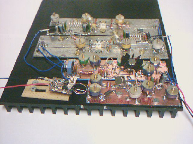 Alle Verstärkerstufen und der Steuersender werden mit doppelseitig kupferbelegtem Platinenmaterial hergestellt wobei die untere Kupferfläche mit Masse (-) verbunden wird. Alle Verstärkerstufen werden auf eine Kühlfläche geschraubt, wobei die Transistoren 2SC 3021 und 2SC 2695 direkt auf die Kühlfläche geschraubt werden. Dazu können entweder Gewinde in die Kühlfläche geschnitten werden oder nach dem Bohren der Löcher auf der Unterseite Muttern zur Befestigung der Schrauben verwendet werden. Zur besseren Wärmeableitung kann man zwischen Transistor und Kühlfläche Wärmeleitpaste aufbringen.