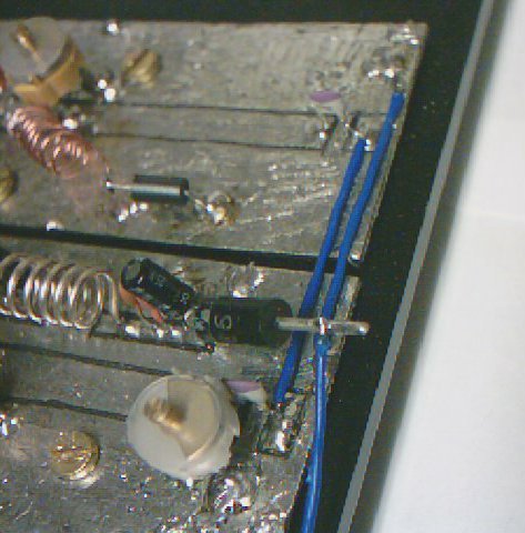 Die Verbindung zwischen den letzten zwei Verstärkerstufen. Der dritte nach unten führende Draht hat mit der Kopplung nichts zu tun, er ist die Plusleitung zur Verstärkerstufe die hier über eine Diode geführt wird damit der Transistor bei der Verpolung der Betriebsspannung nicht zerstört wird. Die vier Verstärkerstufen werden mit 12 bis 13 Volt Gleichstrom betrieben. Der Steuersender kann mit dem Strom aus einem Funktionsgenerator betrieben werden (siehe auch Elektrische Wirkung auf die Nerven) und arbeitet mit Spannungen von 5-12 Volt. Zum Betrieb muß eine Antenne an den Radiofrequenzgenerator angeschlossen werden damit die Transistoren nicht durch Überlastung zerstört werden. Die Antenne kann aus einem Stück Draht (15 bis 20 cm) bestehen.
