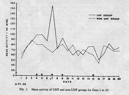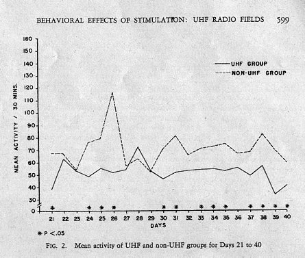 Es ist offensichtlich, daß die Einwirkung von UHF Radiowellen niedriger Frequenz und niedriger Stärke eine Auswirkung auf das Verhalten hat. Insgesamt ergibt sich, daß diese Strahlung die folgenden im Versuch untersuchten Punkte beeinflusst: Grad der Aktivität, Emotionalität sowie Dauer des Krampfes nach Elektroschock. Bei der Betrachtung der Aktivität im Verlauf der Tage ergibt sich, daß eine gewisse Zeit benötigt wird bis die UHF Wellen eine gleichmäßige Wirkung auf das Verhalten haben. Am 30. Tag unterscheidet sich das Verhalten der beiden Gruppen und bleibt unterschiedlich, wobei die bestrahlte Gruppe ständig weniger aktiv ist als die nicht bestrahlte Kontrollgruppe. Aus den Daten ergibt sich auch eine Umkehrung der Wirkung im Verlauf der Tage. Die Bestrahlung verursacht zuerst eine Zunahme der Aktivität, der dann bei fortdauernder Bestrahlung eine ständige Abnahme der Aktivität folgt. Die Ergebnisse deuten auf ein emotionelleres Verhalten bei den bestrahlten Ratten hin, denn diese vermieden die stark beleuchteten Felder mehr als die unbestrahlten Tiere. (...)