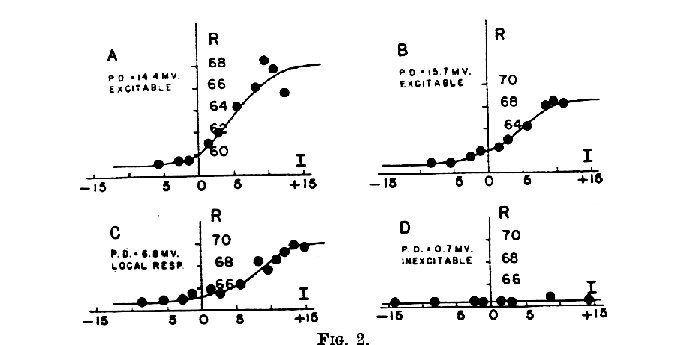 Es war möglich einen Zusammenhang zwischen der Gleichrichtung und Änderungen in Ruhepotential und Erregbarkeit durch gleichzeitige Messungen an derselben Nervenfaser zu zeigen ( Bild 2 ). Mit der Zeit erreicht das Ruhepotential einer Nervenfaser den Wert Null. Die Erregbarkeit wurde durch die Messung des Aktionspotentials mit einem Kathodenstrahloszillographen gemessen. In Bild 2A und 2B war die Nervenfaser erregbar. In Bild 2C gab es Hinweise auf eine lokale Reaktion, aber ein Impuls wurde nicht weitergeleitet. In Bild 2D gab es nicht einmal eine örtliche Reaktion und es fand auch keine Gleichrichtung statt.