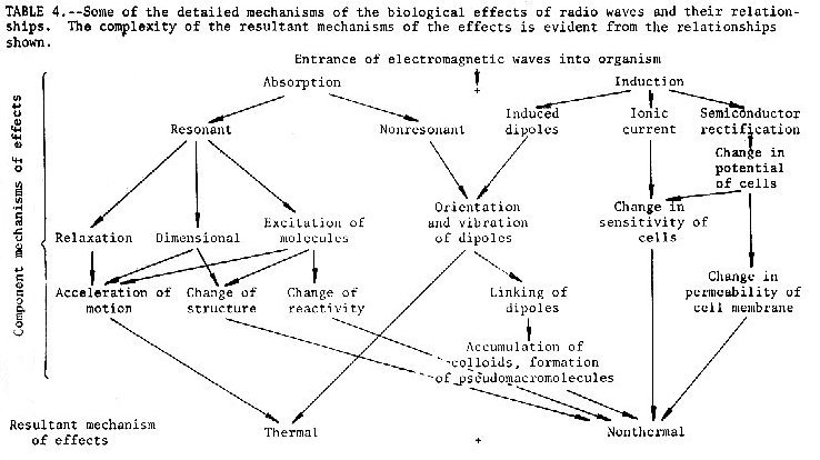There is no uniform explanation for the resultant mechanism of the effects of electromagnetic waves. The reason is that there may be a whole series of independent primary mechanisms, several of which may be acting simultaneously for a given set of parameters. The complexity of the resultant effects of electromagnetic waves on the organism is best shown by Table 4.