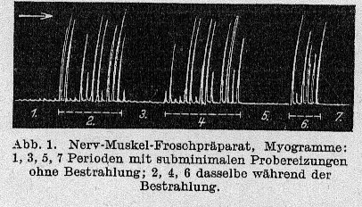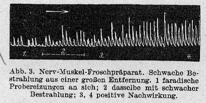 In einigen Versuchen wurden die Elektroden-Vibratoren in einem Abstand von je 75 cm beiderseits des Nerven so aufgestellt, daß das Nerv-Muskelpräparat zwischen den beiden zu stehen kam. In solchen Fällen wurde eine maximale Steigerung der Erregbarkeit des Nerven erzielt; die Muskelkontraktionen stiegen vom ersten Augenblick der Bestrahlung auf eine enorme Höhe, obwohl sie von denselben faradischen Probereizungen stammten, die vor der Bestrahlung nur minimale Höhen ergaben. (..)