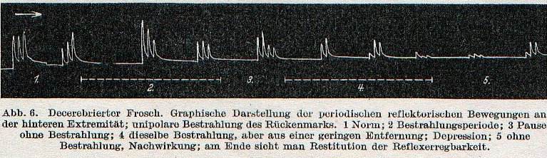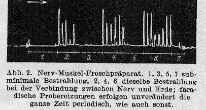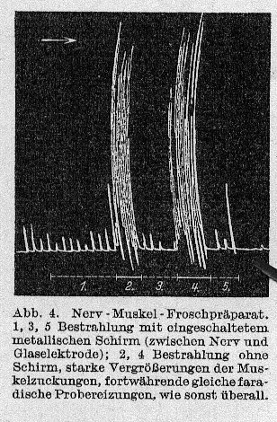 Unsere Beobachtungen führten wir an Fröschen aus, bei denen durch voraufgegangene Dekapitation oder einen Schnitt durch das Mittelhirn die willkürlichen Bewegungen beseitigt waren. Die hintere Extremität wurde mit einem Schreibhebel in Verbindung gesetzt. Reflektorische Bewegungen derselben wurden, wie in den Versuchen an Nerven, durch "Probefaradisation" erzielt, die wie sonst von konstanter Stärke waren und mit periodischer Regelmäßigkeit durch die vordere Extremität durchgeleitet wurden. Die reflektorischen Bewegungen des Hinterbeins zeichneten sich durch große Regelmäßigkeit aus. (...) Hatten wir die Stärke der Probereizung fixiert, so begannen wir den Frosch ( vom Rücken aus ) zu bestrahlen, wobei die Kondensator-Glaselektrode etwa 20-30 Sek. lang in einem Abstand von 10 bis 15 cm und mehr gehalten wurde.