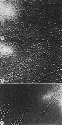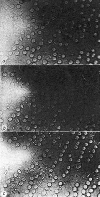 Im Allgemeinen fanden wir keinen Unterschied in der Perlenkettenbildung zwischen gepulster und ungepulster Kurzwellendiathermie gleicher Frequenz und niedriger Leistung. Weiterhin fanden wir, daß bei ungepulster Kurzwellendiathermie die sofortige Aneinanderreihung der Tropfen ( innerhalb einer Sekunde ) viel leichter stattfand ( Bild 5c ). Perlenkettenbildung bei Milch findet viel schneller bei ungepulsten als bei gepulsten Kurzwellenströmen statt, selbst dann wenn der Abstand zwischen Diathermieelektrode und Drahtschleife 2 Meter beträgt. Bei diesem Versuch wurde das Diathermiegerät mit der geringsten möglichen Ausgangsleistung betrieben.