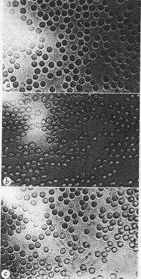 Ähnliche Untersuchungen wurden mit verdünntem Blut durchgeführt. Bei unverdünntem Blut war es unmöglich, einen Bereich zu finden in dem man die Perlenkettenformation beobachten konnte, da die Anzahl der vorhandenen Partikel zu groß war. Aus diesem Grund entschieden wir uns, heparinisiertes Blut mit 0,9prozentiger Salzlösung mit Hilfe einer Zählpipette für rote Blutkörperchen auf das Hundertfache zu verdünnen. Mit der geringsten möglichen Leistung, 1-1 ( wie bei den Versuchen mit der Milch ), war die hämolytische Wirkung so stark und so schnell, daß es schwierig war Aufnahmen zu machen, obwohl wir die Neigung zur Kettenbildung sehen konnten. Bei einer Vergrößerung des Abstandes zwischen der Drahtschleife und der Trommel mit der Kurzwellenelektrode konnten wir eindeutige Perlenkettenbildung hervorrufen ( Bild 6 ). Auch hierbei gab es eine Tendenz zur Hämolyse und zur Bildung von Geisterzellen. Da es notwendig war, Milch ( und Blut ) zu verdünnen, waren wir neugierig, wie sich unverdünnte Körperflüssigkeiten verhalten würden. Wir entschieden uns für Rattenlymphe bei der die Gerinnung durch die Zugabe einer geringen Menge Heparinpulver verhindert wurde. Mit der geringsten möglichen Leistung erhielten wir ohne Probleme eine Perlenkettenbildung der Leukozyten ( weiße Blutkörperchen ) in unverdünnter Lymphe ( Bild 7a, b und c )
