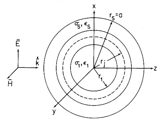 Bild 1. Sechslagiges Kugelmodell des Schädels unter Bestrahlung mit einer sich in Richtung der Z-Achse fortpflanzenden ebenen Welle.