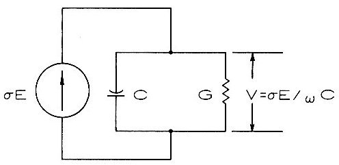 Eine elektromagnetische Welle innerhalb eines biologischen Materials verursacht einen Stromfluß der Nervenmembranen durchdringt, was sich aus dem Ersatzschaltkreis für die Nervenmembran in Bild 8 ergibt ( Anmerkung des Übersetzers: Ein Ersatzschaltkreis bildet die elektrischen Eigenschaften eines oder mehrerer elektronischer Bauteile oder eben eines biologischen Körpers mit anderen genormten Bauteilen nach, so daß man elektrische Vorgänge an ihm untersuchen kann ). Das Ersatzschaltbild zeigt die Kapazität ( C ) und die Konduktanz ( G ) der Membran sowie die durch das elektromagnetische Feld verursachte Stromdichte ( J ).