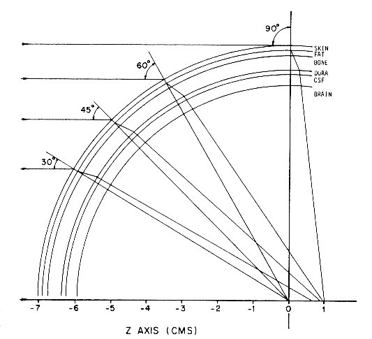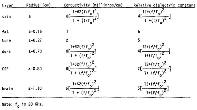 Bei einem aus einer mehrlagigen Kugel bestehende Modell eines menschlichen Schädels ( Bild 1 ) mit den in Tabelle 1 wiedergegebenen elektrischen Eigenschaften und Schichtdicken wurde die Änderung der Stärke der absorbierten Energie in Abhängigkeit von der verwendeten Frequenz an unterschiedlichen Orten im Schädel festgestellt.