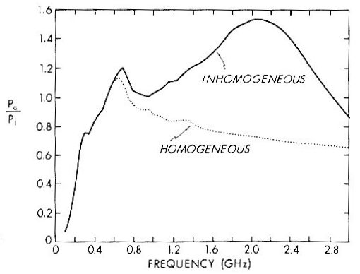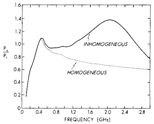 Bild 3. Relative Leistungsaufnahme in Abhängigkeit von der Frequenz für inhomogene ( sechslagige ) und homogene ( einlagige ) Kugelmodelle mit einem äußeren Radius von 10 cm