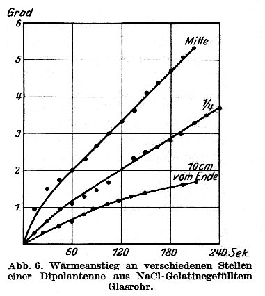 Die Strom- und Spannungsverteilung muß dann die gleiche sein wie beim Dipol. Da die Kenntnis etwaiger Wärmevorgänge und ihrer Verteilung besonders im Hinblick auf die Verhältnisse im menschlichen Körper von großer Wichtigkeit schien, habe ich entsprechende Modellversuche unternommen. Glasrohre von der halben Wellenlänge ( 150 cm ) wurden mit physiologischer Kochsalzlösung gefüllt. Zur Verhinderung der Konvektion diente ein Gelatinezusatz, der die Lösung zum Erstarren brachte. Diese Rohre wurden als Dipol mit dem Schwingungskreis induktiv gekoppelt; durch Thermoelemente wurde dabei der Temperaturanstieg pro Minute gemessen. Schon nach wenigen Sekunden zeigte sich eine Erwärmung der Lösung, und zwar am stärksten in der Mitte, am geringsten an den beiden Enden. Die Kurve ( Abb. 6 ) ist das Ergebnis einer solchen Messung, wobei alle 10 Minuten abgelesen wurde. Wie man sieht, steigt die Erwärmung bei 1/4 und 3/4 der Rohrlänge fast genau halb so rasch an als in der Mitte; an den Enden ist sie sehr gering.