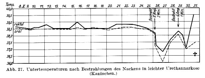 (S.261) Bei einem Kaninchen wurde (...) nach Betäubung mit 4 ccm subcutan eingespritzter 20 %iger Urethanlösung eine Bestrahlung von Brust und Nacken ausgeführt. Abb. 27 gibt die bald danach eingetretene starke Senkung der Körperwärme wieder. Eine erneute Bestrahlung nach 3 Tagen hatte den gleichen Erfolg.