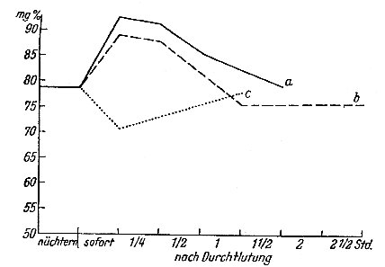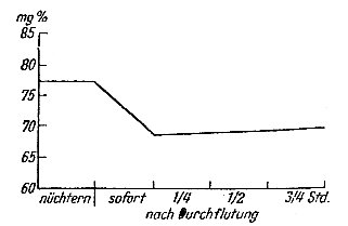 Bei 8 von 18 Personen stieg der Blutzucker um durchschnittlich 11,4 mg ( höchstens 18, wenigstens 7 mg% ). Nach ca. 1/4 Stunde folgte ein allmählicher Abfall zum Ausgangswert. In 6 Fällen erfolgte ein Anstieg um durchschnittlich 9,7 mg% mit schnellerem Abfall nach 1/2 bis 1 Stunde bis unter den Ausgangswert der über 2 Stunden bestehen blieb. In 3 Fällen sank der Blutzuckerwert sofort nach der Durchflutung um 9, 11 und 12 mg%. Nur bei einer Person blieb der Blutzucker unbeeinflusst.