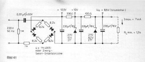 Beim Einbau in elektrische Geräte oder in Steckdosen und Schaltern kann man die Batterie durch ein Netzgerät ersetzen. Folgendes Netzgerät arbeitet ohne Transformator und benötigt dadurch weniger Platz. Eine Kombination von Abhörgerät und Netzgerät lässt sich ohne weiteres in einer Dreifachsteckdose unterbringen, und wird durch das Verbinden des Steckers mit dem Stromnetz eingeschaltet. Solche Sender können über Jahre hinweg ohne Wartung in Betrieb bleiben.